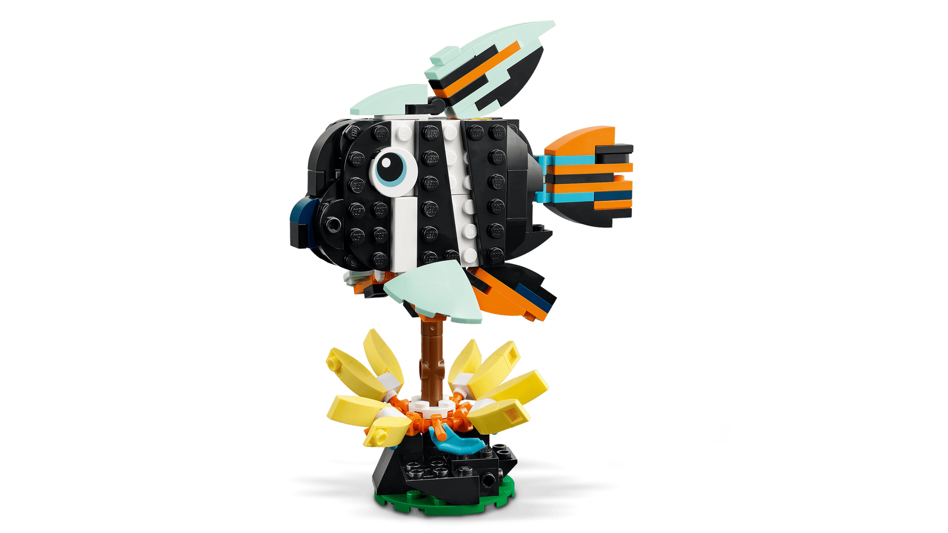 Con gli stessi mattoncini, i bambini hanno a disposizione 3 diverse opzioni di costruzione del playset LEGO con animali: un tucano giocattolo snodabile con una fetta di anguria che può essere inserita nel becco, una farfalla colorata con ali snodabili che vola sopra un prato e un supporto fiorito e un pesce tropicale con pinne snodabili che può ruotare di 360 gradi sul suo supporto con fondale marino.