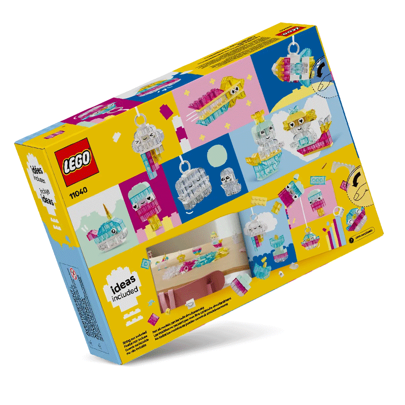 I bambini iniziano costruendo un cuore, un fantasma, una sirena, una stella e un unicorno. Man mano che la loro sicurezza aumenta, possono costruire un’astronave, una nuvola, una stella cadente, un uccello, un narvalo, un gelato e un fiore. Successivamente, potranno aumentare il divertimento creativo con un grande castello e un drago giocattolo. I mattoncini trasparenti, gli occhi e le bocche e i mattoncini-gancio per l’esposizione aggiungono brillantezza trasparente e divertimento extra creativo alle creazioni dei bambini.